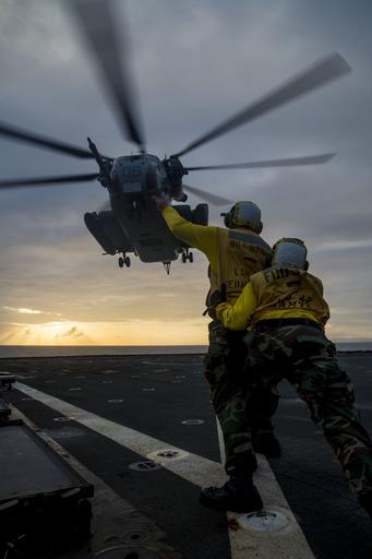 | Keywords: USS Germantown operations 141031-N-XM324-176.jpg  en Logistics Specialist Seaman Maretta Stubbs from San Antonio foreground braces Boatswain ™s Mate 2nd Class Brian Potter from Buffalo N Y as a CH-53E Super Stallion helicopter assigned to the Flying Tigers of Marine Heavy Helicopter Squadron HMH 361 takes-off from the flight deck of the amphibious dock landing ship USS Germantown LSD 42 during exercise Blue Chromite Blue Chromite is an amphibious training exercise with the 4th Marine Regiment and the 2nd Battalion 9th Marines Germantown is part of the Peleliu Amphibious Ready Group PELARG14 commanded by Capt Heidi Agle and is conducting joint forces exercises in the U S 7th Fleet area of responsibility U S Navy photo by Mass Communication Specialist Seaman Patrick Dionne/Released 2014-10-31 Seaman Apprentice Patrick Dionne https //www dvidshub net/image/1649210 141031-N-XM324-176 2014-11-07 23 16 PHILIPPINE SEA AT SEA PD-USGov-Military-Navy Sikorsky CH-53E Super Stallion 2nd Battalion 9th Marines USS Germantown LSD-42 Images from DoD uploaded by Fæ |