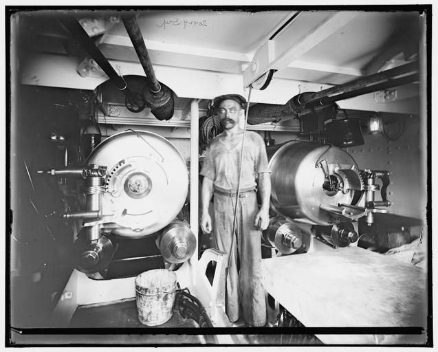 Keywords: USS Indiana 13 inch guns & gunner LOC 4a14250v.jpg U S S Indiana 13 inch guns forward turret and crewman http //www loc gov/pictures/resource/det 4a14250/ Repository Library of Congress Prints and Photographs Division Washington D C 20540 USA Digital ID digital file from intermediary roll film det 4a14250 Reproduction Number LC-D4-20424 A b w glass neg LC-D4-20424 B /det 4a14250 circa 1895-1901 not stated PD-USGov 13 /35 caliber naval gun Indiana USS Indiana BB-1 Gun breeches |