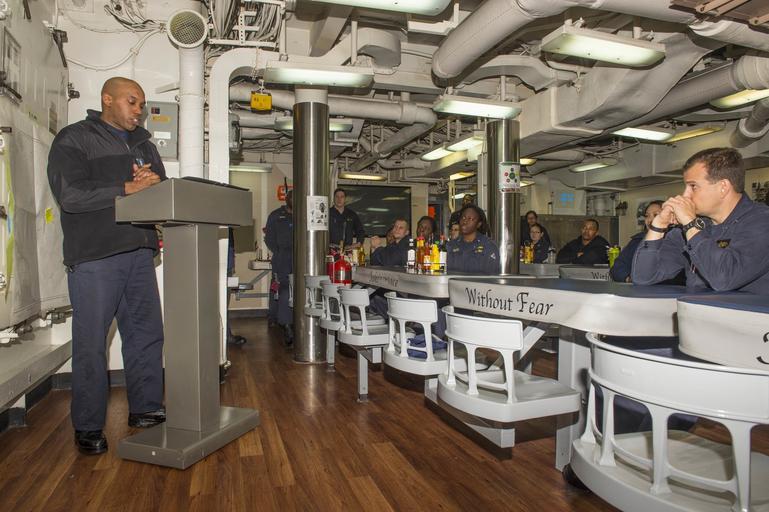 | Keywords: USS Laboon Black History Month Celebration 150219-N-XB010-009.jpg en 150219-N-XB010-009 ATLANTIC OCEAN Lt j g Marquis Jones USS Laboon command chaplain speaks about Dr Martin Luther King Jr during a Black History Month Celebration aboard ship Feb 19 2015 Laboon an Arleigh Burke-class guided-missile destroyer home ported in Norfolk is underway conducting naval operations in the U S 6th Fleet area of operations in support of U S national security interests in Europe 2015-02-19 Feb 19 2015 https //www dvidshub net/image/1778821 150219-N-XB010-009 2015-02-20 13 47 USS LABOON ATLANTIC OCEAN AT SEA PD-USGov-Military-Navy Black History Month Images from DoD uploaded by Fæ |