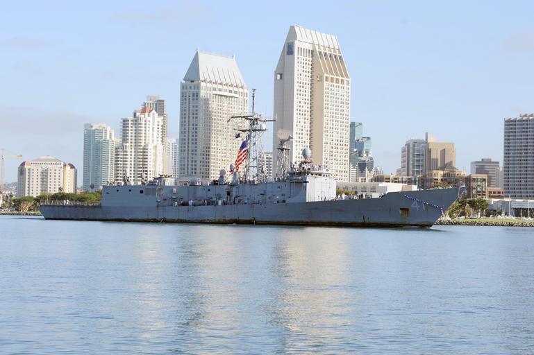 Keywords: USS McClusky (FFG-41) returns from final deployment in September 2014.JPG en The U S Navy Oliver Hazard Perry-class frigate USS McClusky FFG-41 returns to Naval Base San Diego California USA from its final deployment to the U S 4th Fleet area of responsibility McClusky participated in Operation Martillo a U S European and Western Hemisphere partner-nation effort targeting illicit trafficking routes in coastal waters by Central America McClusky is scheduled to be decommissioned in January 2015 2014-09-26 140926-N-DH124-024 Navy http //www navy mil/view_image asp id 185331 U S Navy photo by Mass Communication Specialist 1st Class Rosalie Chang PD-USGov-Military-Navy USS McClusky FFG-41 Naval Base San Diego in the 2010s |