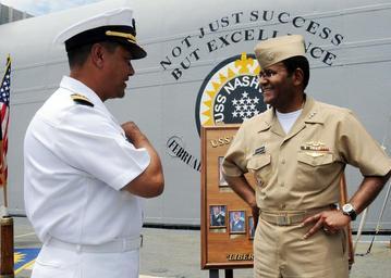 | Keywords: USS Nashville returns to port DVIDS180365.jpg en Commander 2nd Fleet Vice Adm Mel Williams Jr speaks with Capt Tushar Tembe commanding officer of the amphibious transport dock ship USS Nashville LPD 13 as the ship returns to Naval Station Norfolk after a five-month deployment in support of Africa Partnership Station APS is a multinational initiative developed by commander U S Naval Forces Europe and commander U S Naval Forces Africa to work with U S and international partners to enhance maritime safety and security in West and Central Africa Nashville deployed in support of maritime security operations and theater security cooperation efforts in the U S 5th and 6th Fleet areas of responsibility 2009-06-12 Petty Officer 3rd Class Tyler Wilson https //www dvidshub net/image/180365 090612-N-+++++-037 2009-06-16 18 06 NORFOLK VA US PD-USGov-Military-Navy Naval Station Norfolk Images from DoD uploaded by Fæ |