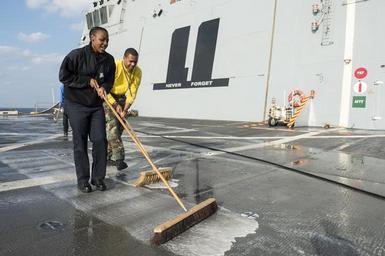 Keywords: USS New York operations 150220-N-XG464-062.jpg en 150220-N-XG464-062 ARABIAN GULF - Aviation Boatswain's Mate 2nd Class Denilya Williams a Conyers Ga native and Aviation Boatswain's Mate 3rd Class Christopher Sewell a Cincinnati Ohio native both stationed aboard the amphibious transport dock ship USS New York sweep water and salt off the flight deck during a fresh-water wash down Feb 24 2015 New York is a part of the Iwo Jima Amphibious Ready Group and with the embarked 24th Marine Expeditionary Unit is deployed in support of maritime security operations and theater security cooperation efforts in the U S 5th Fleet area of operations 2015-02-20 Feb 20 2015 https //www dvidshub net/image/1788454 150220-N-XG464-062 2015-02-26 17 18 USS NEW YORK ARABIAN GULF AT SEA PD-USGov-Military-Navy 24th Marine Expeditionary Unit Images from US Navy location Iwo Jima Japan Images from DoD uploaded by Fæ |