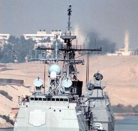 Keywords: USS Normandy Radar.jpg Source Image-Source is http //www navsource org/archives/04/040160 htm Image is cut November 16th 1997 On board the nuclear powered aircraft carrier USS George Washington CVN 73 As seen from the aft of the USS George Washington the ticonderoga class Cruiser USS Normandy CG 60 underway in the Suez Canal Following a Presidential order to head for the Arabian Gulf region elements of the George Washington battle group led by the carrier immediately left their regularly scheduled station in the Mediterranean and began the 7 day passage to the Gulf which starts with a Suez Canal transit George Washington will join the USS Nimitz battle group already on station Both will enforce UN sanctions against Iraq by patrolling the No-Fly Zone under Operation Southern Watch U S Navy Photo by Photographer's Mate 1st Class James Westfall - Digital Film Scan 971116-N-1067W-002 PD-USN Aboard USS Normandy CG-60 Ship radars of the United States Navy AN/SPG-62 AN/SPQ-9 |