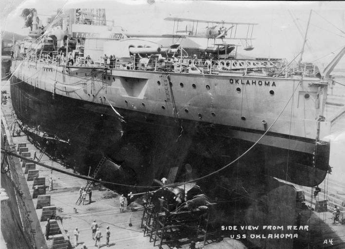 | Keywords: USS Oklahoma BB-37 dry dock 1920s.jpg View of the stern of the U S Navy battleship USS Oklahoma BB-37 in drydock in the 1920s Note the Vought UO-1 observation aircraft on the stern catapult U S Navy National Museum of Naval Aviation photo No 2000 003 001 http //collections naval aviation museum/emuwebdoncoms/pages/common/imagedisplay php irn 16000002 reftable ecatalogue refirn 16045941 QueryPage 2FQuery php s 1920 U S Navy PD-USGov-Military-Navy USS Oklahoma BB-37 Catapults ship Vought UO floatplanes |