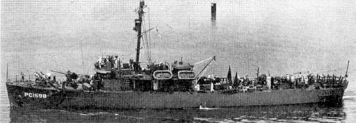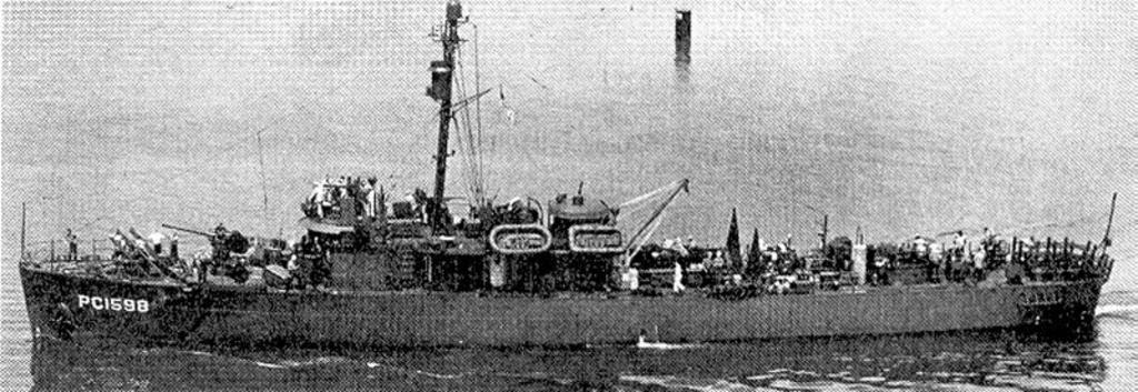 MAKE A MEME View Large Image USS PC-1598.jpg en With her new hull number already applied PC-1598 displays the armament fitted to the Pacific units by Norfolk Navy Yard Forward of the 3-inch gun are two 12-round Mk 22 Mousetrap antisubmarine rocket launchers and two Mk ...