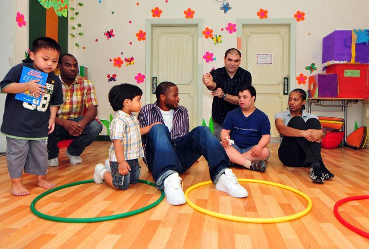 | Keywords: USS Pearl Harbor DVIDS317536.jpg en Petty Officer 3rd Class Ralph Oliver religious programs specialist far left Petty Officer 3rd Class Stephen Williams damage controlman center Lt Stephen Zachary chaplain and Seaman Kinita Walters logistics specialist far right spend time with children at the RIA Institute in Manama Bahrain Sailors from the amphibious dock landing ship USS Pearl Harbor LSD 52 participated in a community relations project at the RIA Institute playing various games trying yoga and swimming Pearl Harbor is part of Peleliu Amphibious Ready Group supporting maritime security operations and theater security cooperation efforts in the U S 5th Fleet area of responsibility 2010-08-12 Petty Officer 2nd Class Michael Russell https //www dvidshub net/image/317536 100812-N-+++++-037 2010-09-12 02 41 BH PD-USGov-Military-Navy USS Pearl Harbor LSD-52 Manama Images from DoD uploaded by Fæ |