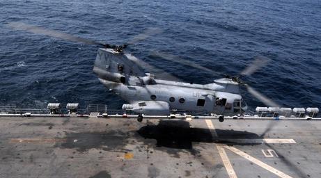 Keywords: USS Peleliu DVIDS310737.jpg en A Marine Corps CH-46 Sea Knight assigned to Helicopter Marine Medium Squadron White Knights launches from the flight deck aboard amphibious assault ship USS Peleliu The CH-46 will join the 11 other helicopters from Peleliu already on station in northern Pakistan The Peleliu Amphibious Ready Group is supporting the Pakistani government and military with helicopter heavy lift capabilities in flooded regions of Pakistan 2010-08-18 HMM-165 https //www dvidshub net/image/310737 100818-N-+++++-053 2010-08-19 00 25 ABOARD USS PELELIU AT SEA PD-USGov-Military-Navy CH-46 Sea Knight USS Peleliu LHA-5 Images from DoD uploaded by Fæ |