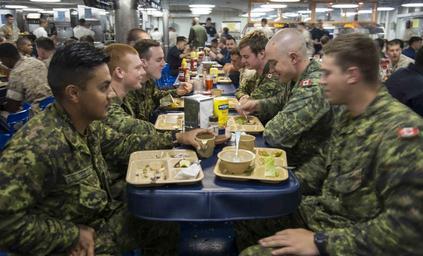 Keywords: USS Peleliu operations 140709-N-SU278-001.jpg en Canadian soldiers assigned to Princess Patricia's Light Infantry Division embarked aboard the amphibious assault ship USS Peleliu LHA 5 finish a meal on the mess decks alongside U S Navy Sailors U S Marines and soldiers and sailors from other countries including Republic of Korea Japan Malaysia and Australia during Rim of the Pacific RIMPAC Exercise 2014 Twenty-two nations more than 40 ships and submarines more than 200 aircraft and 25 000 personnel are participating in RIMPAC exercise from June 26 to Aug 1 in and around the Hawaiian Islands The world's largest international maritime exercise RIMPAC provides a unique training opportunity that helps participants foster and sustain the cooperative relationships that are critical to ensuring the safety of sea lanes and security on the world's oceans RIMPAC 2014 is the 24th exercise in the series that began in 1971 U S Navy photo by Mass Communication Specialist 3rd Class Will Gaskill/Released 2014-07-09 Petty Officer 3rd Class William Gaskill https //www dvidshub net/image/1443242 140709-N-SU278-001 2014-07-10 23 04 AT SEA PD-USGov-Military-Navy USS Peleliu LHA-5 RIMPAC 2014 Images from DoD uploaded by Fæ Princess Patricia's Canadian Light Infantry |