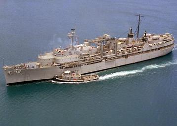 | Keywords: USS Proteus AS-19 1980.jpeg en The large harbor tug USS Saco YTB-796 maneouvers the U S Navy submarine tender USS Proteus AS-19 into port at the U S Naval Base Guam on 24 May 1980 U S Defenseimagery mil photo VIRIN DN-SC-88-08187 Camera Operator PH2 Kline USN 1980-05-24 USS Proteus AS-19 PD-USGov-Military-Navy |