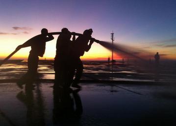Keywords: USS Ronald Reagan Action DVIDS340064.jpg en Sailors hose down the flight deck of the aircraft carrier USS Ronald Reagan with seawater during a Scrub Exercise A SCRUBEX is necessary to clean salt water spray off the skin of the ship to prevent corrosion Ronald Reagan is underway preparing for an upcoming deployment 2010-11-14 Photo by Petty Officer 3rd Class Alexander Tidd https //www dvidshub net/image/340064 101114-N-+++++-026 2010-11-15 05 32 ABOARD USS RONALD REAGAN AT SEA PD-USGov-Military-Navy Flight deck maintenance aboard USS Ronald Reagan CVN-76 Images from DoD uploaded by Fæ |