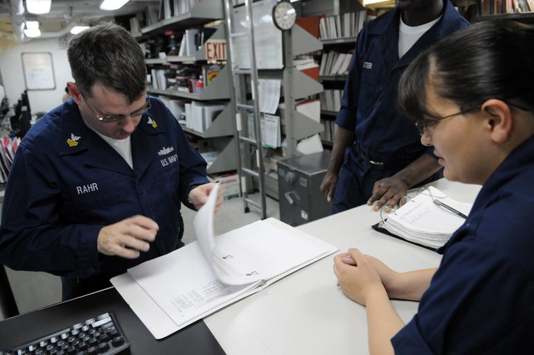 | Keywords: USS Ronald Reagan activity DVIDS179205.jpg en Petty Officer 1st Class Kenneth Rahr searches for a wire diagram so Petty Officer 3rd Class Jasmine Moran can complete a trouble call on board the aircraft carrier USS Ronald Reagan Wire diagrams give electronics technicians a map of audio and video cables connected throughout the ship When there are errors in a frequency an electronics technician can find the location with the help of a wire diagram Ronald Reagan is on a routine deployment to the Western Pacific <br>Unit Navy Media Content Services 2009-06-12 Petty Officer 3rd Class Torrey Lee https //www dvidshub net/image/179205/uss-ronald-reagan-activity 090612-N-+++++-005 2009-06-12 19 54 USS RONALD REAGAN PD-USGov-Military-Navy USS Ronald Reagan CVN-76 Images from DoD uploaded by Fæ |