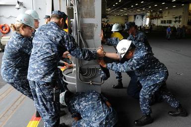 | Keywords: USS Ronald Reagan maintenance 130731-N-AV746-238.jpg en Deck department sailors maneuver a sliding pad eye into position for routine maintenance in the hangar bay of the aircraft carrier USS Ronald Reagan CVN 76 Ronald Reagan is in home port at Naval Base Coronado U S Navy photo by Mass Communication Specialist 2nd Class Timothy M Black/Released 2013-07-31 Petty Officer 2nd Class Timothy Black https //www dvidshub net/image/986714 130731-N-AV746-238 2013-08-01 18 19 SAN DIEGO CA US PD-USGov-Military-Navy Maintenance on USS Ronald Reagan CVN-76 Images from DoD uploaded by Fæ |