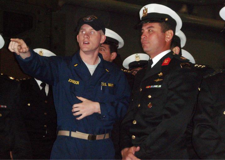 Keywords: USS San Antonio visits Alexandria, Egypt DVIDS154677.jpg en Ensign Matt Johnson electronic warfare officer aboard the amphibious transport dock ship USS San Antonio explains landing craft assault cushion operations to an Egyptian naval officer during a tour aboard the ship San Antonio is in Alexandria to commemorate the 100th anniversary of The Great White Fleet a historic U S goodwill voyage around the world 2009-02-24 Lt Charity Hardison https //www dvidshub net/image/154677 090224-N-+++++-008 2009-03-04 01 40 ALEXANDRIA EG PD-USGov-Military-Navy USS San Antonio LPD-17 Images from DoD uploaded by Fæ |