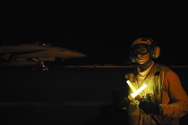 Keywords: USS Theodore Roosevelt operations 151002-N-ZF498-126.jpg en 151002-N-ZF498-126 ARABIAN GULF Aviation Boatswain's Mate 3rd Class Brett Siebel checks to verify the flight line is clear before giving the signal to launch a F/A-18F Super Hornet assigned to the Red Rippers of Strike Fighter Squadron 11 during night-time flight operations aboard the aircraft carrier USS Theodore Roosevelt Theodore Roosevelt is deployed in the U S 5th Fleet area of operations supporting Operation Inherent Resolve strike operations in Iraq and Syria as directed maritime security operations and theater security cooperation efforts in the region <br>Unit Navy Media Content Services 2015-10-02 Oct 2 2015 https //www dvidshub net/image/2226208/uss-theodore-roosevelt-operations 151002-N-ZF498-126 2015-10-11 03 08 USS THEODORE ROOSEVELT ARABIAN SEA PD-USGov-Military-Navy F/A-18F Super Hornet USS Theodore Roosevelt CVN-71 Images from DoD uploaded by FĂŚ |