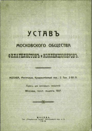 | Keywords: Ustav MOFIK.jpg en Cover of the Charter of the Moscow society of philatelists and collectors 1918 ru Обложка Устава осковского общества филателистов и коллекционе ов 1918 Magazine Philately 12-2007 Scanned and processed by A Sdobnikov 2009-03-15 PD-trivial Philatelic literature Philatelic organisations PD-old |