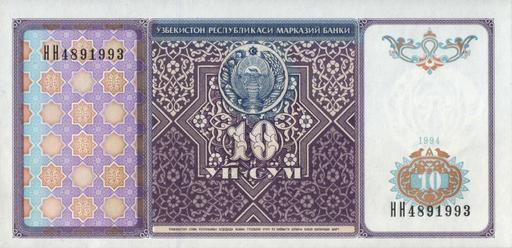 | Keywords: UZS10 1994 front.jpg 10 cум узбекистана 1994 10 soms of Uzbekistan 1994 Ouzbekistan Billet de 10 sums recto own scan 1994 Цент альный банк Республики Узбекистан The Central bank of the Republic of Uzbekistan Ўзбекистон Республикаси ма казий банки PD-UZ-exempt banknotes Banknotes of Uzbekistan Banknotes with a face value of 10 1994 banknotes Coats of arms of Uzbekistan on banknotes |