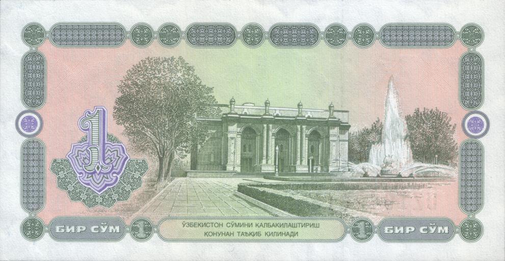 | Keywords: UZS1 1994 back.jpg 1 cум узбекистана 1994 1 som of Uzbekistan 1994 own scan 1994 Цент альный банк Республики Узбекистан The Central bank of the Republic of Uzbekistan Ўзбекистон Республикаси ма казий банки PD-UZ-exempt banknotes Banknotes of Uzbekistan Alisher Navoi Opera and Ballet Theatre Banknotes with a face value of 1 Green banknotes Buildings on banknotes Fountains on banknotes |