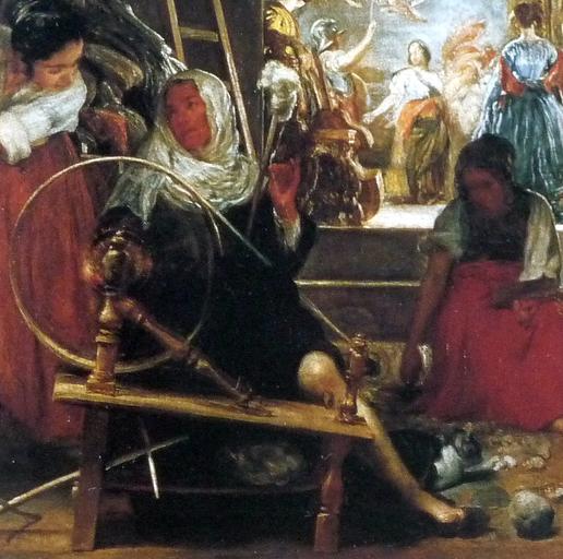 | Keywords: V Hilanderas detail 2.JPG Artwork Q984058 Creator Diego Velázquez La obra representa el momento en que la tejedora Aracne fue convertida en araña por la diosa Atenea y es una de las obras mitológicas más conocidas del pintor sevillano Diego Velázquez Ca 1655-1660 oil on canvas Size cm 289 220 Institution Museo del Prado https //www museodelprado es/coleccion/obra-de-arte/las-hilanderas-o-la-fabula-de-aracne/3d8e510d-2acf-4efb-af0c-8ffd665acd8d accession number P01173 own PD-old-100 cc-by-sa-3 0 GFDL Details of Las Hilanderas Spinning wheels in art |