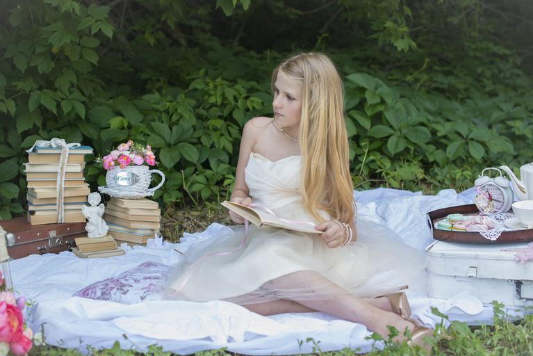 Keywords: vacation tea party sweets nature picnic summer greens on the nature girl outdoors beauty stroll dress mood green leaves happiness white dress girls model beautiful posture image
