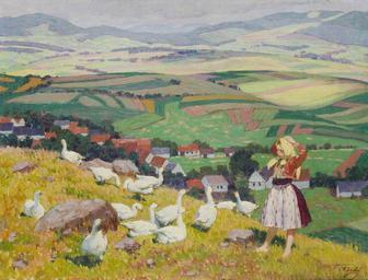 Keywords: Václav Malý Gänsehirtin.jpg Gänsehirtin rechts unten signiert V Malý Öl/Leinwand 52 x 67 cm http //www dorotheum com Dorotheum by 1935 Creator Václav Malý PD-old-70 Images from Dorotheum Václav Malý painter Gooseherds in art