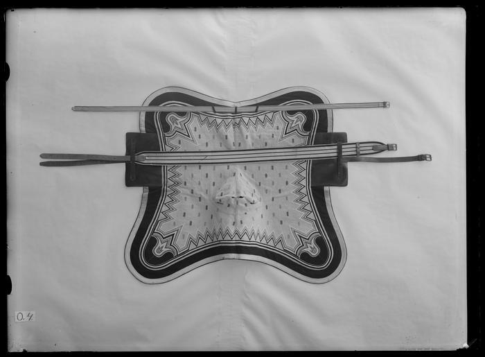 Keywords: Valtrapp, Oscar IIs hovstall - Livrustkammaren - 641.tif LSH artwork sv Valtrapp formsydd efter sadel Rundade hörn och ryggsöm Blå kantbård av kläde runt om bredd 85 mm med en påsydd gul remsa i kanten bredd 30 mm Ylle i mitten troligen broderat i gula liggaren kallad täckbroderad Gul botten med röda och blå strödda prickar Sick-sackmönstrade kanter mot bården samt kurbitsliknande tulpaner i hörnen Allt i vitt svart rött gult och blått I mitten tre skåror för sadeln de två yttre läderkantade Skåran i mitten mäter 90 mm i längd skårorna på sidorna mäter 45 mm i längd Två rektangelformade läderstycken på sidorna av svart lackat skinn I mitten av båda läderstyckenas nederkanter finns en rem för fäste under buken Läderstyckenas bredd 320 mm höjd 213 mm Remmarnas bredd 30 mm Ena remmen har ett kvadratiskt spänne av järn med en nål och löphylsa samt två tvärgående smalare lädersöljor för fäste av remmen en fast och en rörlig bredd 15 mm På andra sidan har remmen en spetsformad ände och 12 hål En liggande hälla av svart läder med rundade ändar fäst i nederkanten på båda läderstyckena för fäste av sadelgjorden Bredd 250 mm höjd 27 mm En sadelgjord av textilt band med invävda längsgående ränder i blått och gult Avsmalnande ändar som löper ut i bruna skinnremmar med fyrkantigt metallspänne på ena sidan med en nål och löphylsa Nedanför spännet en fast lädersölja bredd 20 mm På andra sidan rem med spetsformat avslut och 12 hål Sadelgjordens bredd 85 mm skinnremmens bredd 30 mm Total längd 2075 mm På sadelgjorden en över hela bredden tvärgående skinnhälla fäst 195 mm från spännet bredd 19 mm På sadelgjordens insida två längsgående hällor i mitten en fäst 630 mm från spännet Den andra fäst 200 mm från andra änden Båda mäter i bredd 25 mm längd 80 mm Textilband fäst längs framkanten i tre hällor av blått ylle vid valtrappens mitt Bandet är randigt med blå och gula längsgående ränder bredd 33 mm längd 1810 mm Ena änden har ett rektangelformat spänne av gulmetall med en nål av vitmetall samt en fast lädersölja nedanför bredd 10 mm Andra änden har ett spetsformat avslut <br/>Foder fram och bak av svart vaxduk I mitten vit linnelärft Två ojämna skinnremmar fästa i fodrets mittsöm 70 mm från framkanten Spridda rester av enfärgat papper fastklistrat på vaxduken Vidhängande rund etikett av papp fäst med ståltråd i ena hällan av läder på läderstyckena med text 08/7 original caption < 1908 broadcloth Färg blå gul S - SADLAR OCH HÄSTUTRUSTNING material kläde - woolen Färg blå gul röd vit svart S - SADLAR OCH HÄSTUTRUSTNING material ylle - linen Färg ofärgat S - SADLAR OCH HÄSTUTRUSTNING material linnelärft - leather Färg svart brun S - SADLAR OCH HÄSTUTRUSTNING material läder - iron S - SADLAR OCH HÄSTUTRUSTNING material järn g 2859 size mm 1425 1155 LRK Oscar II av Sverige -Norge place of origin original filename LN_B03530_006410 56218 inventory number LRK 19638 641 CC0 Valtrapp Oscar IIs hovstall - Livrustkammaren - 641-negative tif Horse equipment Media contributed by LSH unmatched material Media contributed by LSH 2015-11 |