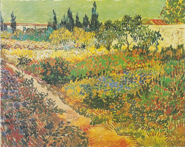 Keywords: Van Gogh - Blühender Garten mit Pfad.jpeg Blühender Garten mit Pfad Flowering Garden with Path oil canvas 72 x 91 cm Den Haag Haags Gemeentenmuseum Van Gogh catalogues 429 1513 repro from art book Arles July 1888 Creator Vincent van Gogh PD-old-100 Other versions Flowering Garden with Path by Vincent van Gogh