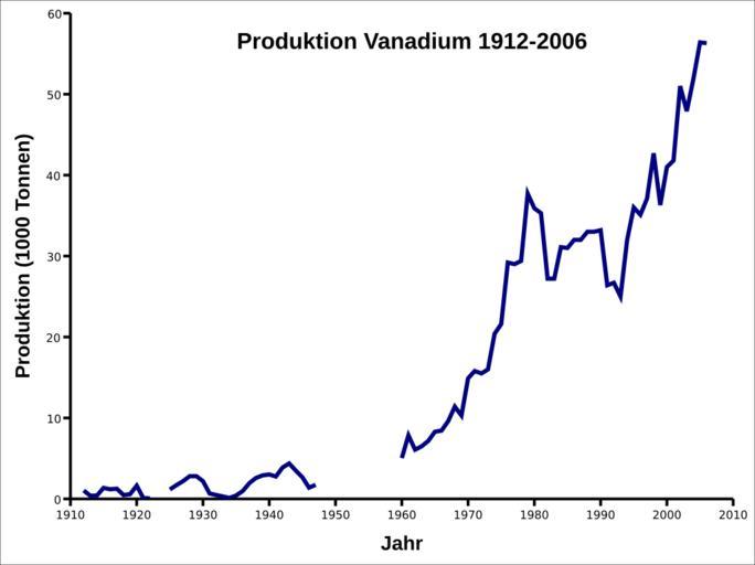 | Keywords: Vanadium-Produktion.svg en mine production of vanadium from 1912 to 2006 de Vanadiumproduktion von 1912-2006 deutsche Version Eigenes Werk own work Daten aus http //minerals usgs gov/ds/2005/140/vanadium pdf Orci 5 10 2008 thumb left Vanadium Metal production trends |