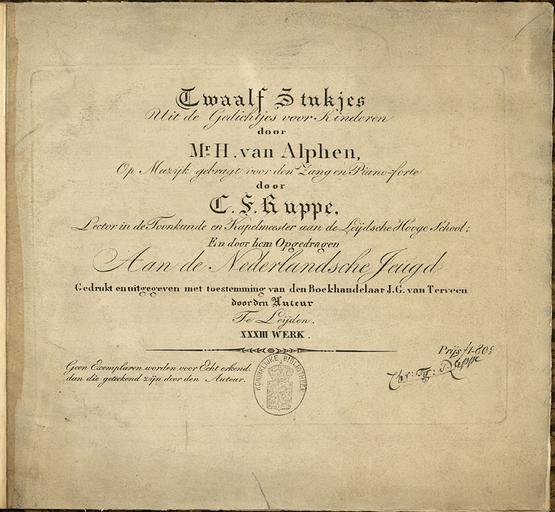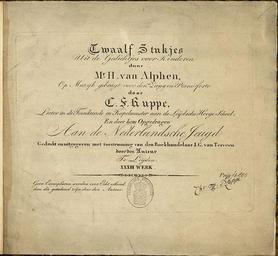 Keywords: VanAlphenRuppe.jpg Mr H van Alphen Op Muziek gebragt voor den Zang en Piano-forte door C F Ruppe Gepubliceerd rond 1824 Music book titled Twaalf Stukjes uit de Gedichtjes voor Kinderen door Mr H van Alphen Op Muziek gebragt voor den Zang en Piano-forte door C F Ruppe Twelve pieces of poems for children by Mr H van Alphen set to music for voice and piano-forte by C F Ruppe Published about 1824 own Book Christian Friederich Ruppe Photo Cosavostra PD-old 1753 births Composers from Germany 1826 births Composers from the Netherlands Classical era composers |