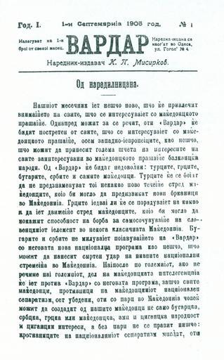 | Keywords: Vardar1.jpg en The cover page of the Macedonian magazine Vardar published by Krste Petkov Misirkov in Odesa on 1 September 1905 mk Ко ица на македонското списание Ва да издадено од ст ана на К сте Петков иси ков во Одеса на 1 септемв и 1905 Originaly uploaded on mk wikipedia org K P Misirkov 1905-01-01 Magazine Vardar PD-old |