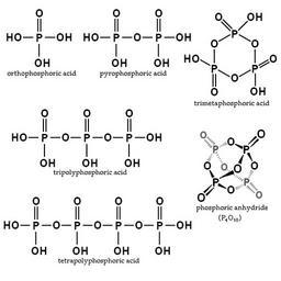 | Keywords: Various Phosphoric Acids.PNG Chemical Structures of Various Phosphoric Acids The following chemical structures are shown in this image orthophosphoric acid pyrophosphoric acid tripolyphosphoric acid tetrapolyphosphoric acid trimetaphosphoric acid phosphoric anhydride P<sub>4</sub>O<sub>10</sub> H Padleckas created this image file on October 21-22 2005 especially for use in the article Phosphoric Acids and Phosphates in Wikipedia H Padleckas 06 00 23 October 2005 UTC In November 2006 H Padleckas modified this image to revise the appearance of the P<sub>4</sub>O<sub>10</sub> molecular strucure H Padleckas 20 52 21 November 2006 UTC 2005-10-23 own assumed H Padleckas Phosphorus oxoacids Phosphoric acids |