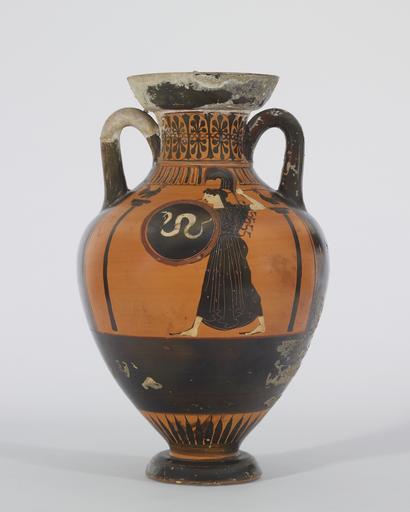 Keywords: Vatican G 23 Group - Black-figure Pseudo-Panathenaic Amphora - Walters 482105 - Side A.jpg On side A Athena is striding to the left with a spear in her raised left hand and a shield in her right with a large snake a popular shield device on Panathenaic vases of the late Archaic period She is wearing a patterned garment a high-crested helmet and the aegis from which several snake heads clearly emerge Two thin columns crowned by roosters frame the scene The reverse shows two young jockeys in high gallop in the heat of the race Both boys are nude and ride without saddles or stirrups guiding the horse with their reins The rider in the back is using a whip in his raised right hand to gain some ground on his opponent The focus is clearly on the rider on the left whose horse occupies the composition's foreground its head partially obscuring the other rider The prominence of the horse and rider captured at a decisive moment in the race may signal the contest's victor The amphora lacks the prize inscription on the front that is characteristic of small-scale copies created for trade and as commemorative souvenirs of the Panathenaic prize amphoras see Bentz 1998 19-22 Dorothy Hill noted that the piece is stylistically and thematically close to the work of the Eucharides Painter who painted at least three full-scale Panathenaic prize amphoras depicting two riders competing Maul-Mandelartz 1990 105 ca 500 480 BC late Archaic terracotta cm 41 26 4 accession number 48 2105 39632 St Audries Collection date and mode of acquisition unknown Sale Sotheby's February 23 1920 no 230 William Randolph Hearst San Simeon date and mode of acquisition unknown William Randolph Hearst Estate Sale May 1958 Walters Art Museum 1958 by purchase Museum purchase 1958 Heroes Mortals and Myths in Ancient Greece The Walters Art Museum Baltimore; Frist Center for the Visual Arts Nashville; San Diego Museum Of Art San Diego; Alexander S Onassis Public Benefit Foundation USA New York 2009-2011 place of origin Attica Greece Walters Art Museum license Ancient Greek black-figure pottery in the Walters Art Museum Group of Vatican G 23 Pseudo-Panathenaic amphoras Athena in ancient Greek pottery Media contributed by the Walters Art Museum needs artist update |