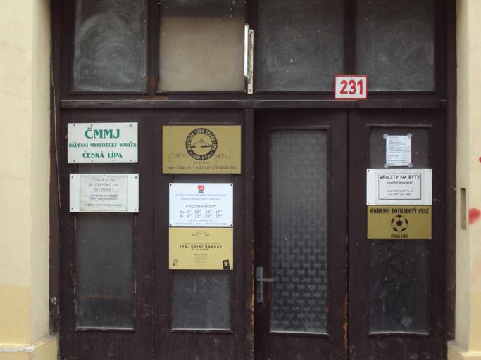 Keywords: Vchod 231.jpg cs Starší cedule na domě Žižkova 231 nad náměstím domov mnoha českolipských spolků senátorská kancelář Kapouna OV fotbalistů OV ČSTV atd own Zákupák 2010-09-09 Žižkova Česká Lípa Signs in the Czech Republic Doors in Česká Lípa Conscription house numbers in the Czech Republic 231 house number |