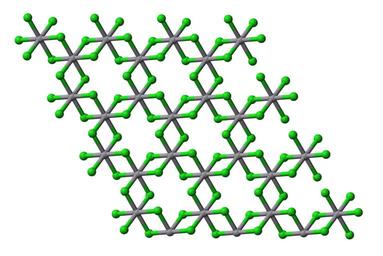 | Keywords: VCl3-layer-in-xtal-1947-3D-balls.png Ball-and-stick model of a single layer plan view in the crystal structure of vanadium III chloride VCl<sub>3</sub> Based on the crystal structure reported in http //dx doi org/10 1002/zaac 19472530313 W Klemm E Krose Z Anorg Allg Chem 1947 253 218-225 Crystallographic data from the http //www crystallography net Crystallography Open Database Colour code grey Vanadium V grey green Chlorine Cl green Model manipulated and image generated in http //accelrys com/products/discovery-studio/visualization/discovery-studio-visualizer html Accelrys DS Visualizer Own 2016-04-20 Ben Mills Benjah-bmm27 Images by Ben Mills Vanadium III chloride |