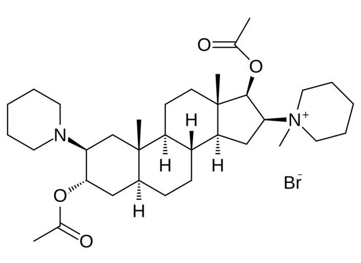 | Keywords: Vecuronium bromide.svg  Chemical structure of vecuronium bromide Own 23 33 24 May 2014 UTC Ed Edgar181 200px Acetate esters Quaternary ammonium compounds Bromide salts of organic compounds Steroidal alkaloids Neuromuscular blocking agents Lethal injection drugs |