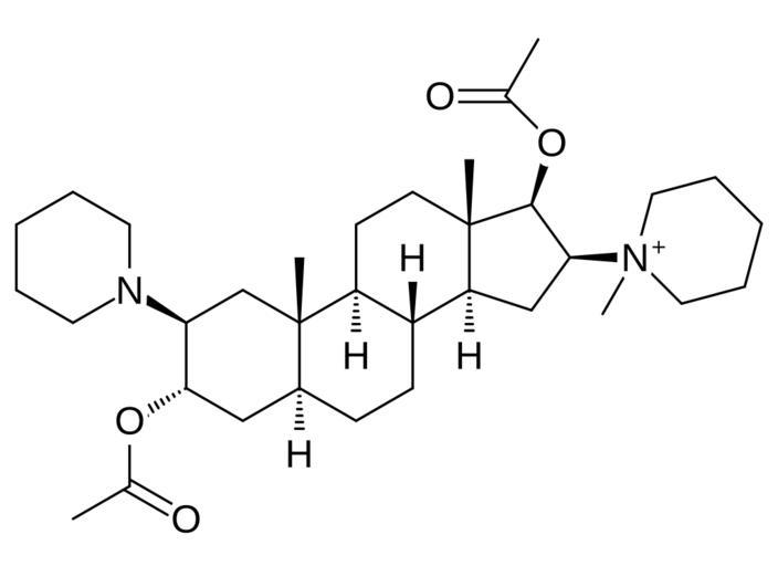 Keywords: Vecuronium.svg Chemical structure of vecuronium Own 23 32 24 May 2014 UTC Ed Edgar181 200px Acetate esters Steroidal alkaloids Piperidines Quaternary ammonium ions Neuromuscular blocking agents