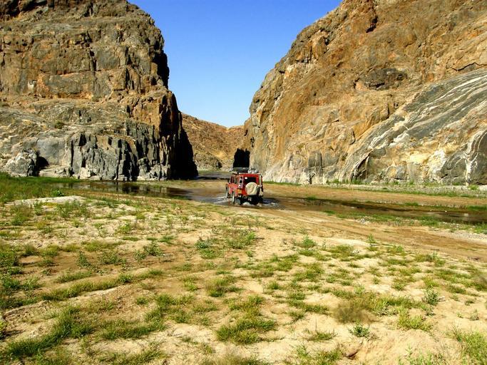 Keywords: vehicle rocks water cliffs hills stone desert bare desolate namibia
