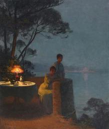 Keywords: Veillée en bord de mer.jpg en Evening in front of the Mediterranean Sea Cote d'Azur Oil on canvas 21 65 x 18 11 inches fr Veillée devant la Mer Méditerranée Côte d'Azur Huile sur toile 55 x 46 cm Collection privée <br />Photograph by Méticuleux Marcel Rieder 1862-1942 Marcel Rieder |