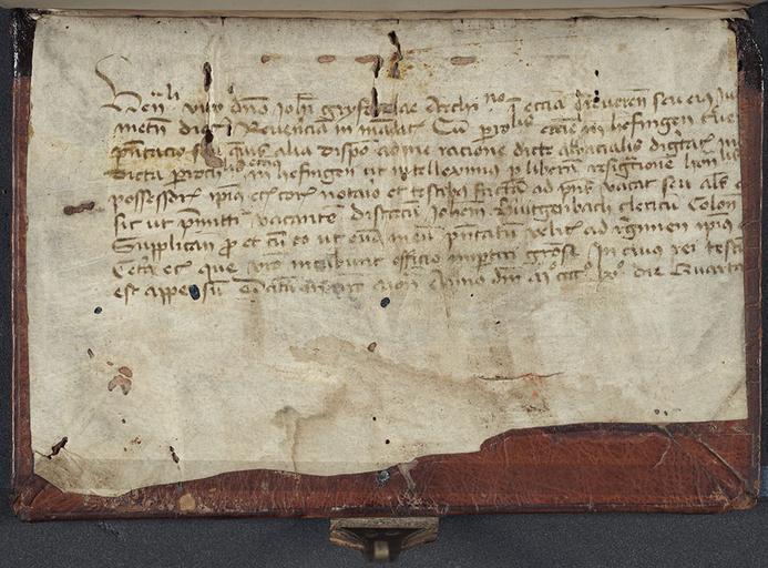 | Keywords: incunables incunabula illumination 15th century 15thcentury fifteenth century fifteenthcentury manuscript fragments manuscriptfragments bookbinding text writing photo border Sebastian Brant, Das Narrenschiff [Latin] (Augsburg: Johann Schönsperger, 1 Apr. 1497). RSM BRANT Stul 1497. Many incunables incorporate earlier manuscripts which have been cut up and re-used in the binding process. This fragement has been used as a pastedown. A pastedown is the first or last leaf in a book which is pasted onto the inside of the boards to hide the sewing and where the leather of the cover is turned in. Sebastian Brant, Das Narrenschiff [Latin] (Augsburg: Johann Schönsperger, 1 Apr. 1497). RSM BRANT Stul 1497. Many incunables incorporate earlier manuscripts which have been cut up and re-used in the binding process. This fragement has been used as a pastedown. A pastedown is the first or last leaf in a book which is pasted onto the inside of the boards to hide the sewing and where the leather of the cover is turned in. |