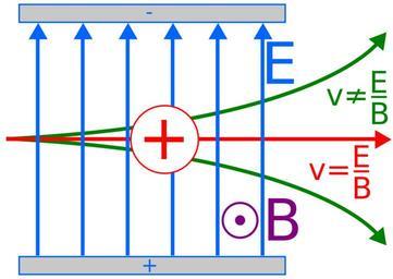 | Keywords: Velocity selector.svg  en Velocity selector in a mass spectrometer The electric force is equal and opposite to the magnetic force only in the case where <math>v \frac E B </math> Particles moving at all other velocities do not travel along a straight path Own Sjlegg 2009-06-02 Mass spectrometry diagrams |