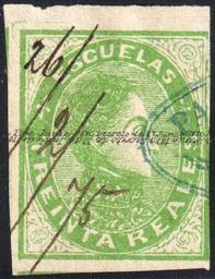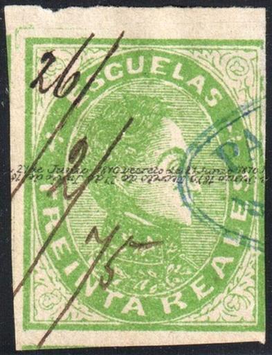 Keywords: Venezuela 1874 FO29.jpg en Venezuela lithographed possibly in 1874 by Felix Rasco in Caracas 30r green fiscal usage in 1875 manuscript cancellation and handstamp Type B overprint <ref> cite book L W Fulcher 1925 The Stamps of Venezuela Escuelas 1871-79 Stanley Gibbons Monthly Journal April 1925 </ref> This is a revenue stamp from a series of stamps which was also was used for postage These were the only stamps used for postage in Venezuela from March 1871 to August 1873 and they were also largely employed for postal purposes in conjunction with the square Arms type with control overprint from this date onwards to 1879 when both were superseded by the larger-sized Escuelas stamp dating 1879 The inscription Escuelas which is Spanish for schools is explained by the fact that the revenue accruing from the use of these stamps was intended to be applied for the purposes of public instruction They are so rarely found postmarked because only a very few places in Venezuela possessed a cancelling stamp at this date and when used on letters they are generally found pen-cancelled At the same time it is true that the great majority of the copies found to-day have been fiscally used The stamps were lithographed the heads being laid down first and the frames added afterwards The stamps fall into three groups depending on overprint type A With control overprint in upright microscopic letters in two double lines reading BOLIVAR SUCREM MIRANDA and DECRETO DE 27 ABRIL DE 1870 B With control overprint in microscopic italic letters in one double line reading DECRETO DE 27 DE JUNIO DE 1870 many times repeated the lines of lettering being tete-beche C With the same overprint as B but in two double lines As far as is known there were eight issues of these stamps Catalogue Forbin 29 1874 Scan of original Venezuela government PD-old-100 Sources reflist Revenue stamps of Venezuela Pen cancels of Venezuela Postal fiscal stamps |