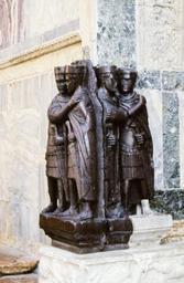 Keywords: Venice Four Emperors 04557.JPG I tetrarchi dal greco quattro regnanti furono i quattro co-regnanti che governarono l'impero romano durante la riforma di Diocleziano Qui sono ritratti mentre si abbracciano in segno di concordia e armonia in una scultura in porfido del IV secolo d C di provenienza orientale oggi a Venezia sull'angolo di San Marco accanto alla Porta della Carta The tetrarchs from the Greek words for Four rules were the four co-rulers that governed the Roman Empire as long as Diocletian's reform lasted Here they were portraied embracing in sign of harmony in a porphyry sculpture dating from the 4th century produced in Asia Minor today on a corner of Saint Mark's in Venice next to the Porta della Carta Venedig “ Die vier Tetrarchen uploaded from Wikipedia 2005 Photo by G Larson w User Glenlarson Glenlarson Statues of the Tetrarchs Venice Corner Statues of four people |