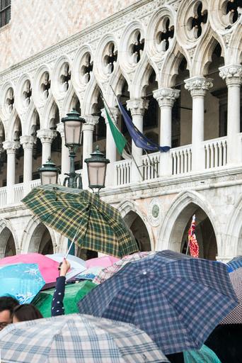 Keywords: venice st mark's square tourists crowd rain umbrellas italy flood venezia historically
