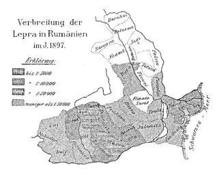 | Keywords: Verbreitung der Lepra in Rumänien im J.1897.JPG en Map of the Romanian Kingdom showing leprosy distribution per county as recorded in 1897 Lepra in Rumänien Berlin 1904 available through the Bucharest City Library http //digitool dc bmms ro 8881/R/3YEN91RDQHN2LLAT98CMIIVH6GP3F19S45D2I6YYIM6AN3KQEN-00734 func search DacoRomanica archive Victor Babeş 1904 Victor Babeș Maps of the Kingdom of Romania Demographic maps of Romania Disease incidence maps of Romania Leprosy in Romania 1897 in Romania 1897 in medicine 1904 maps Maps in German PD-old |