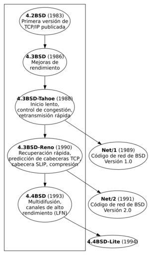| Keywords: Versiones de TCP en BSD.svg Versiones de TCP en BSD es Varias de las primeras versiones del sistema operativo BSD junto con las caracterÃsticas TCP que ofrecÃan Las versiones de la derecha están públicamente disponibles Consisten en todo el código de red protocolos rutinas de kernel y programas como Telnet o FTP Son la base para muchos otros sistemas operativos eo Kelkaj el la unuaj versionoj de operaciumo BSD kun iliaj TCP eblecoj Versionoj dekstre estas publike uzeblaj Ili enhavas ĉian fontkodon retan protokoloj kernaj algoritmoj kaj programoj kiel Telnet aÅ FTP en Some of the first releases of the BSD operating systems along with their TCP features The releases to the right are publically available They include all the network code protocols kernel routines and programs like Telnet or FTP Fuente Este diagrama aparece en varios libros y páginas que explican la historia de TCP Por ejemplo en la página 4 de Ĉi tiu bildo troviÄ as ĉe pluraj libroj kaj paÄ oj kiuj klarigas historion de TCP Ekzemple en paÄ o 4 el This diagram appears at several books and pages which explain the history of TCP For instance at page 4 of TCP/IP Illustrated The Implementation Vol 2 Stevens W Richard; Wright Gary R Ed Pearson Education 1995 ISBN 020163354X A pesar de que la imágen salió por primera vez en el libro Advanced Programming in the UNIX R Environment Stevens W Richard Addison-Wesley 1992 ISBN 0-201-56317-7 Created with Graphviz Dominio público Autor de esta versión SVG Daniel Clemente Laboreo es Usuario 142857 Código Hecho con Graphviz Como no permite usar negrita en los nodos he usado la siguiente orden para generarlo <pre> dot -Tsvg tcp dot sed 's/\ <text >\ \ \ \ 19 <\/text>\ /\1<tspan style font-weight bold >\2<\/tspan> \3e/; s/<svg/<svg style font-size 12px /;' >tcp svg </pre> El código es Graphviz source <source lang dot > Versiones de TCP en BSD Procesar con dot -Tsvg tcp dot sed 's/\ <text >\ \ \ \ 19 <\/text>\ /\1<tspan style font-weight bold >\2<\/tspan> \3e/; s/<svg/<svg style font-size 12px /;' >tcp svg Motivos 1 Graphviz aún no permite usar negrita en los tÃtulos 2 No sé por qué pero las letras salen muy grandes digraph tcp subgraph clusterPr v42 label 4 2BSD 1983 \nPrimera versión de\nTCP/IP publicada ; v43 label 4 3BSD 1986 \nMejoras de\nrendimiento ; v43t label 4 3BSD-Tahoe 1988 \nInicio lento \ncontrol de congestión \nretransmisión rápida ; v43r label 4 3BSD-Reno 1990 \nRecuperación rápida \npredicción de cabeceras TCP \ncabecera SLIP compresión ; v44 label 4 4BSD 1993 \nMultienvÃo \ncanales de alto\nrendimiento LFN ; edge weight 100; v42 -> v43 -> v43t -> v43r -> v44 ; Hace falta un nodo más para que se alinie bien falso style invis; v44 -> falso style invis; n1 label Net/1 1989 \nCódigo de red de BSD\nVersión 1 0 ; n2 label Net/2 1991 \nCódigo de red de BSD\nVersión 2 0 ; v44l label 4 4BSD-Lite 1994 ; v43t -> n1 ; v43r -> n2 ; v44 -> v44l ; </source> SVG network diagrams Timelines Transmission Control Protocol Network infrastructure Images with Graphviz source code |