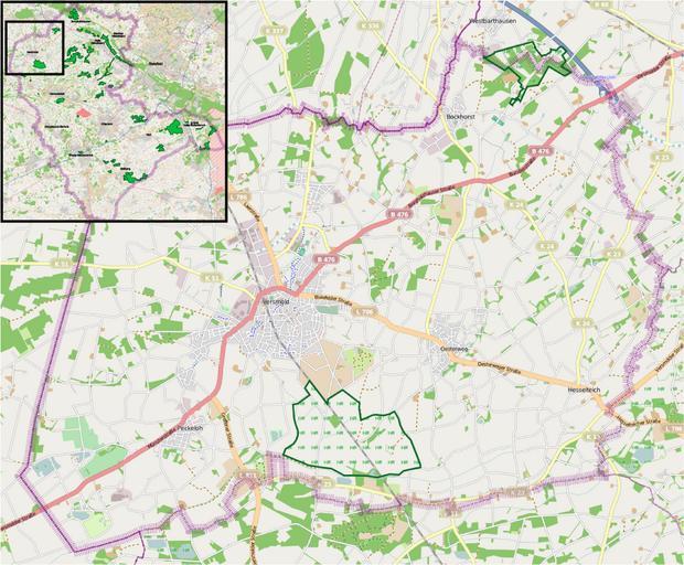 | Keywords: Versmold - nature reserves.png Nature reserves in Versmold - overview map<br/>Number and borders of nature reserves are subject to frequent change In order to facilitate reproduction of this map from openstreetmap the following data is stored here <br/> export boundaries north 52 095; west 8 07 south 51 995; east 8 267 mapnik svg scale 1 70 000<br/> nature reserve boundary stroke weight 3 5; <br/>nature reserve stroke color R 5 G 102 B 36; <br/>district border stroke weight 20 Naturschutzgebiete in Versmold - Ã bersichtskarte Versmold - vue d'ensemble Own based on http //www openstreetmap org/ Open Street Map 2011-04-04 Hagar66 Maps of Versmold Cc-zero |