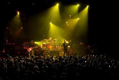 Keywords: Verve MSG.jpg en A picture of The Verve performing at New York's Madison Square Garden in 2008 own Maxcoles135 Musicians with musical instruments Concerts in unidentified countries Yellow light Stage lighting The Verve