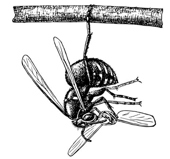 | Keywords: Vespa.eating.fly.-.emerton.1888.svg Vespa sp devouring a fly Full text of the short article <br> Habit of Vespa While going through a swamp filled with alder bushes I noticed hanging in the middle of one a wasp devouring a fly in the position shown in the drawing The wasp hung down by one foot The abdomen was bent up out of the way The half-eaten fly was held by the front feet while the other legs and wings stuck out carelessly in all directions As the mandibles and antennae kept in rapid motion and the fly was turned over and over by the fore feet the wasp swung slowly back and forth with the same appearance of comfort and enjoyment as a man eating an apple in a hammock When the fly had been reduced to wings and shell the wasp let it drop got up on the twig and flew away Psyche 5 54 http //psyche2 entclub org/articles/5/5-054 pdf 1888 James Henry Emerton PD-old Drawings of animals by James H Emerton Vespa Media from Psyche Drawings of wasps |
