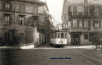 | Keywords: Via Verbano vista da via Sacco. Negli anni '20 la stretta strada verrà allargata e rettificata, l'edificio a destra sarà sostituito da palazzo De Micheli (ing. Edoardo Flumiani) mentre quello a sinistra resterà in piedi fino agli anni '60. tram varese viaverbano viawaltermarcobi |
