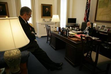 View Original:Vice_President_Cheney_Talks_on_a_Telephone_in_His_Office_While_David_Addington_Stands_Nearby.jpg (4992x3328)