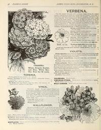 | Keywords: Vick's garden and floral guide (16375564888).jpg  jS FLOWER SEEDS <br> JAMES VICKS SONS ROCHESTER N Y <br> VERBENA <br> VERBENA <br> White Striped Scarlet <br> and Blue White Eye <br> The Four for 30 cents <br> TORENIA <br> Trailing plants for vases baskets etc Annual <br> Torenia Fournieri for moist shady location; velvety-blue flowers <br> six inches 10 <br> Bailloni deep yellow and maroon 10 <br> The Bride new large flowers upper lip white; side segments and <br> lower hp pink ; bottom of corolla yellow 25 <br> VINCA <br> Periwinkle Annual The past summer Vincas have <br> been grown successfully as bedding plants in the Rochester <br> parks and if better known would be more extensively used <br> for this purpose Seeds can be started in the house or <br> under glass; bloom from early summer until destroyed by <br> frost ; and may be potted for the house before frost <br> Vinca rosea rose 10 <br> rosea alba white red eye 10 <br> rosea nova species white 10 <br> Mixed varieties 10 <br> WALLFLOWER <br> By growing Wallflower plants in the ground and trans- <br> planting to pots in the autumn or better by placing plants <br> VINCA in pots when taken from the seed bed and sinking the pots <br> to the rim in earth good plants will be secured for winter <br> flowering in the house Give a cool room and plenty of <br> water Where winters are not very severe the Wallflowers make most desirable plants <br> giving plenty of early spring flowers <br> Wallflower Fine mixed colors fragrant; double; perennial 15 <br> Flowering first season fine mixed colors single 5 <br> Very few annuals will make such a gorgeous display during the summer <br> months or furnish more flowers for cutting than the Verbena Start seed in <br> the house or under glass early in the spring and transplant after three or four <br> inches of growth Good healthy plants can be produced from seed as readily <br> as almost any tender annual They flower in July and continue strong and <br> healthy until destroyed by frost A strange fact that is not generally known <br> is that nearly all the Verbenas raised from seed are fragrant the light colored <br> varieties particularly so The past quarter of a century we have made a spe- <br> cialty of Verbenas and our stock to-day stands at the head <br> Verbena Auricula-flowered or White-eyed mixed colors xo <br> Striped excellent flowers with broad Carna- <br> tion-like stripes 10 <br> Scarlet brightest scarlet quite true 10 <br> Pure White quite true from seed 10 <br> Cloth of Gold iThe golden yellow leaves <br> present a unique appearance fine mixed 10 <br> Ccerulea Blue with white eye 10 <br> Lutea Primrose yellow 10 <br> Purplish Violet with large white center 10 <br> One package of each of above eight OO cents <br> dX S \ Z £ Verbena hybritla extra large flow- <br> ers fine mixed colors choice seed <br> saved only from the most beautiful named flowers ounce 2 10 <br> Mixed colors 5 <br> VIOLETS <br> Viola Odorata is the well-known English Violet a free flowering hardy <br> perennial Easily grown from seed though somewhat slow in germinating; suc- <br> ceeds best in a partially shaded moist place <br> Viola odorata semperflorens deep rich violet blue and deliciously <br> fragrant 10 <br> The Czar in blue or white sweet scented each 10 <br> Viola COrnuta This is a beautiful old border flower which since its <br> introduction into the summer flower-garden has been taken in hand by the hybri- <br> dizer and many lovely forms of it now enrich our collections It commences <br> flowering early in the season and continues until frost Habit and constitution <br> robust; flowers large and delicately fragrant <br> Viola cornuta Admiration magnificent flowers of a beautiful dark blue xo <br> Mixed colors dark blue lavender and white 10 <br> Viola lutea grandiflora 10 <br> splendens large yellow 10 <br> VALERIANA Fine for borders 5 <br> VIRGINIAN STOCK Hardy annual; fine for small beds or edgings <br> Mixed colors ounce 35 cents 5 <br> WILD GARDEN- Mixed seeds per ounce 20 cents 5 <br> VVHITLAVI A Annual with delicate foliage and drooping clusters of blue and white <br> bells Mixed varieties 5 <br> VIOLET CZAR 43864395 149533 78224 Page 38 Text http //www biodiversitylibrary org/page/43864395 1900 10 5962/bhl title 78224 Henry G Gilbert Nursery and Seed Trade Catalog Collection ; James Vick's Sons Rochester N Y Biodiversity Heritage Library Vick's garden and floral guide 1900 Garden Stories Catalogs Commerce Flowers Gardening James Vick's Sons Rochester N Y Rochester N Y Seeds Vegetables U S Department of Agriculture National Agricultural Library bhl page 43864395 dc identifier http //biodiversitylibrary org/page/43864395 James Vicks Sons bhlGardenStories Verbena Violets BHLinbloom james vick's sons rochester n y rochester n y u s department of agriculture national agricultural library james vicks sons bhlgardenstories bhlinbloom Information field Flickr posted date ISOdate 2015-02-17 CC-BY-2 0 BioDivLibrary https //flickr com/photos/61021753 N02/16375564888 2015-08-24 22 57 14 cc-by-2 0 PD-old-70-1923 Verbena Vick's garden and floral guide Photos uploaded from Flickr by Fæ using a script |